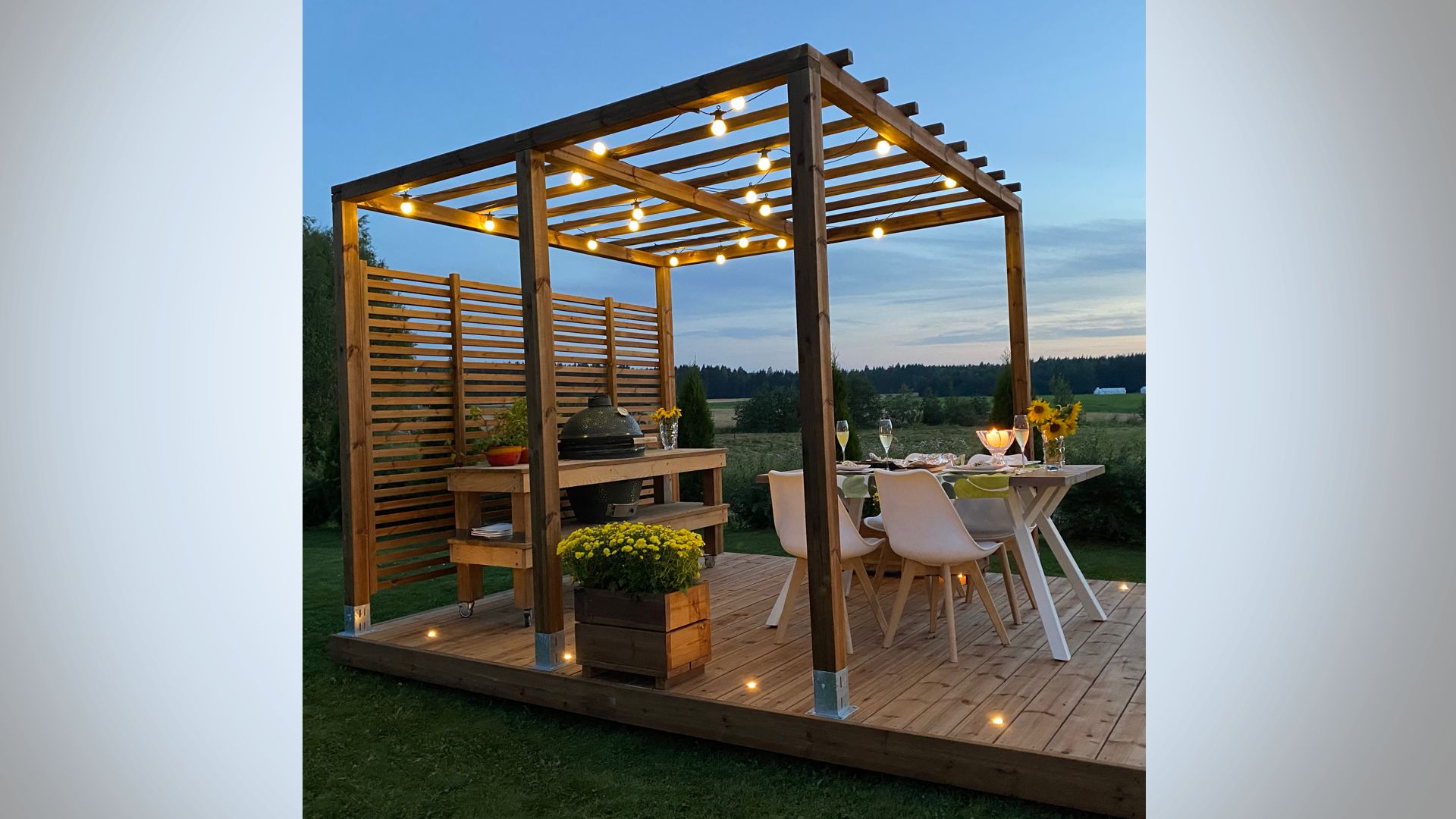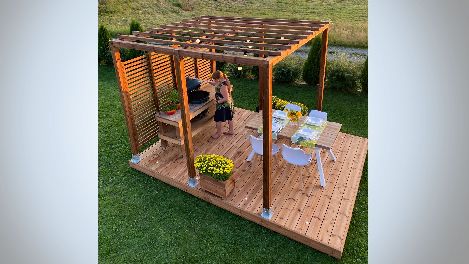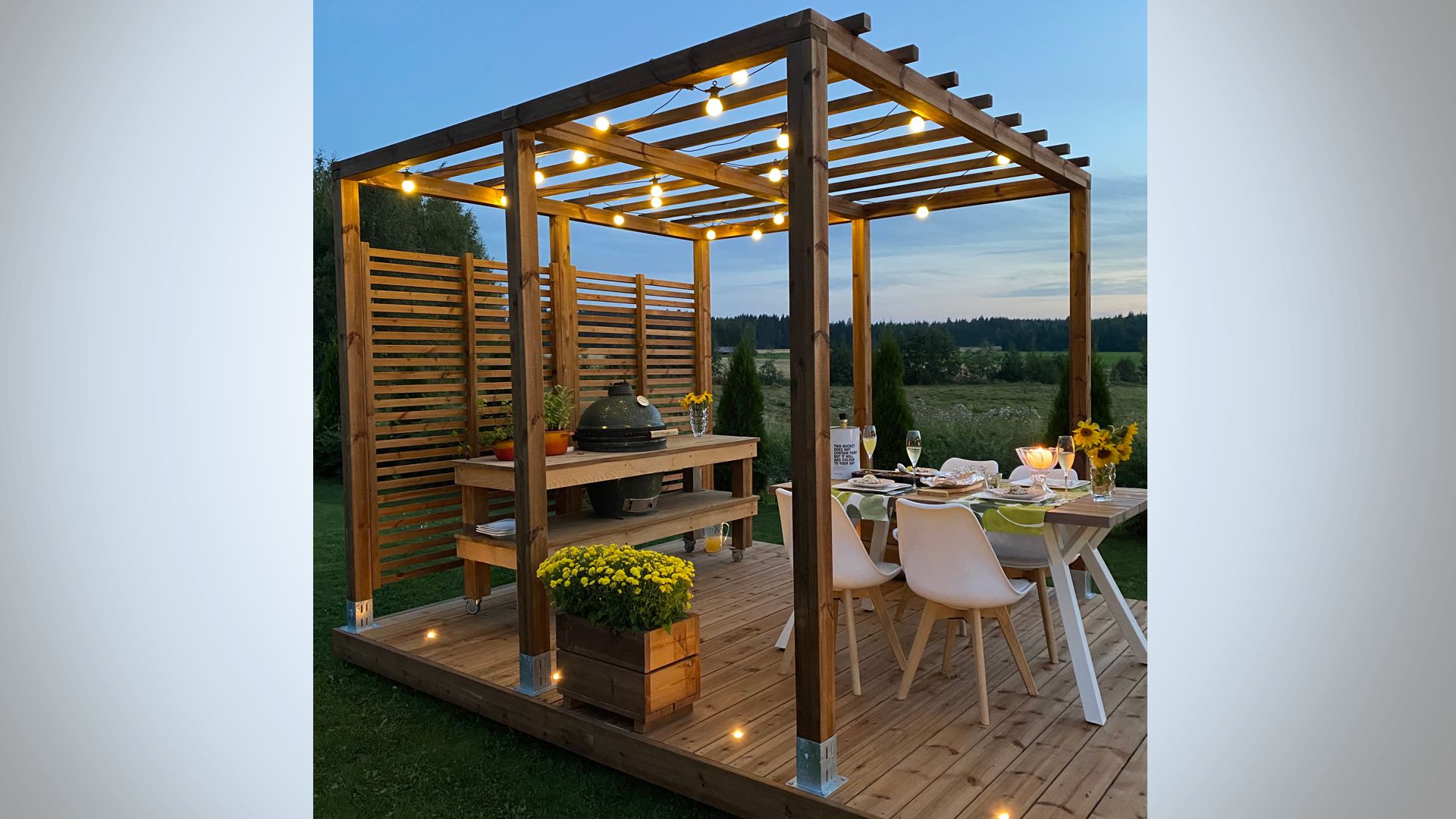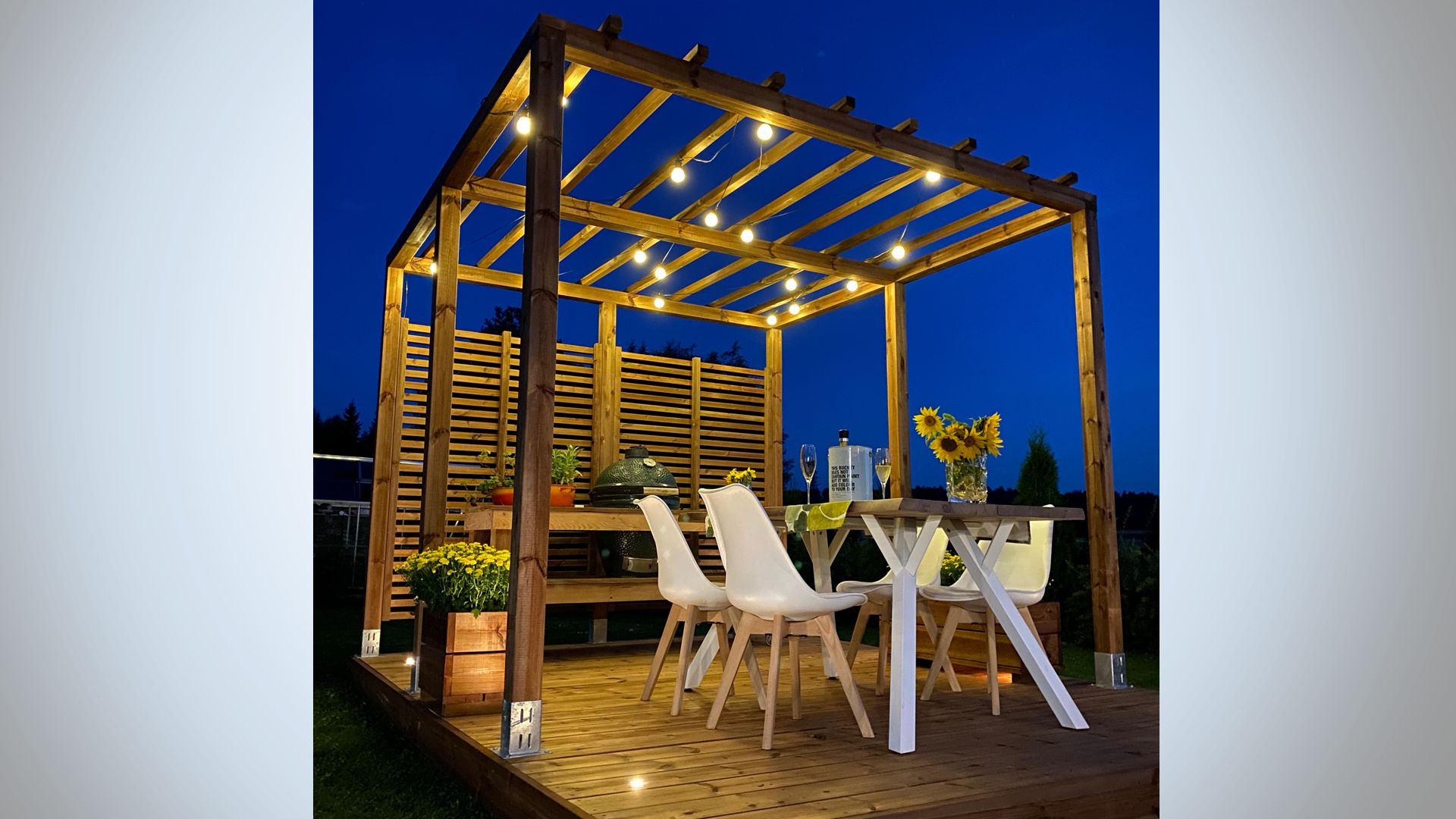 Kolekcija Patio Koko sadrži sve što Vam je potrebno za Vašu terasu! Vaša odabrana Patio gotova terasa, Patio pergola (3×3), vizualna zaštita za jedan zid, kutije za cvijeće (50 i 100 cm, izdržljivo drvo) i naravno također rasvjeta za terasu.