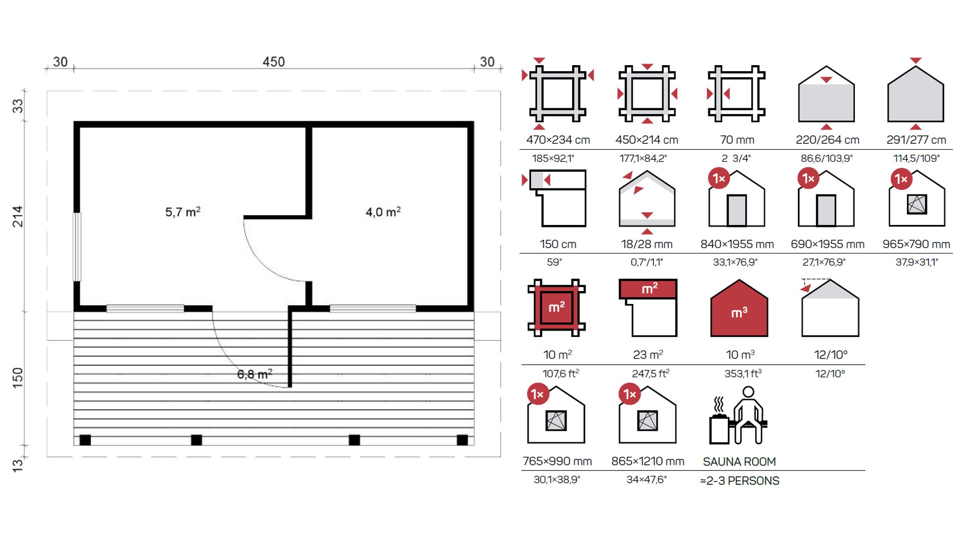 Set Maridinih drvenih sauna debljine 70 mm uključuje sljedeće:
