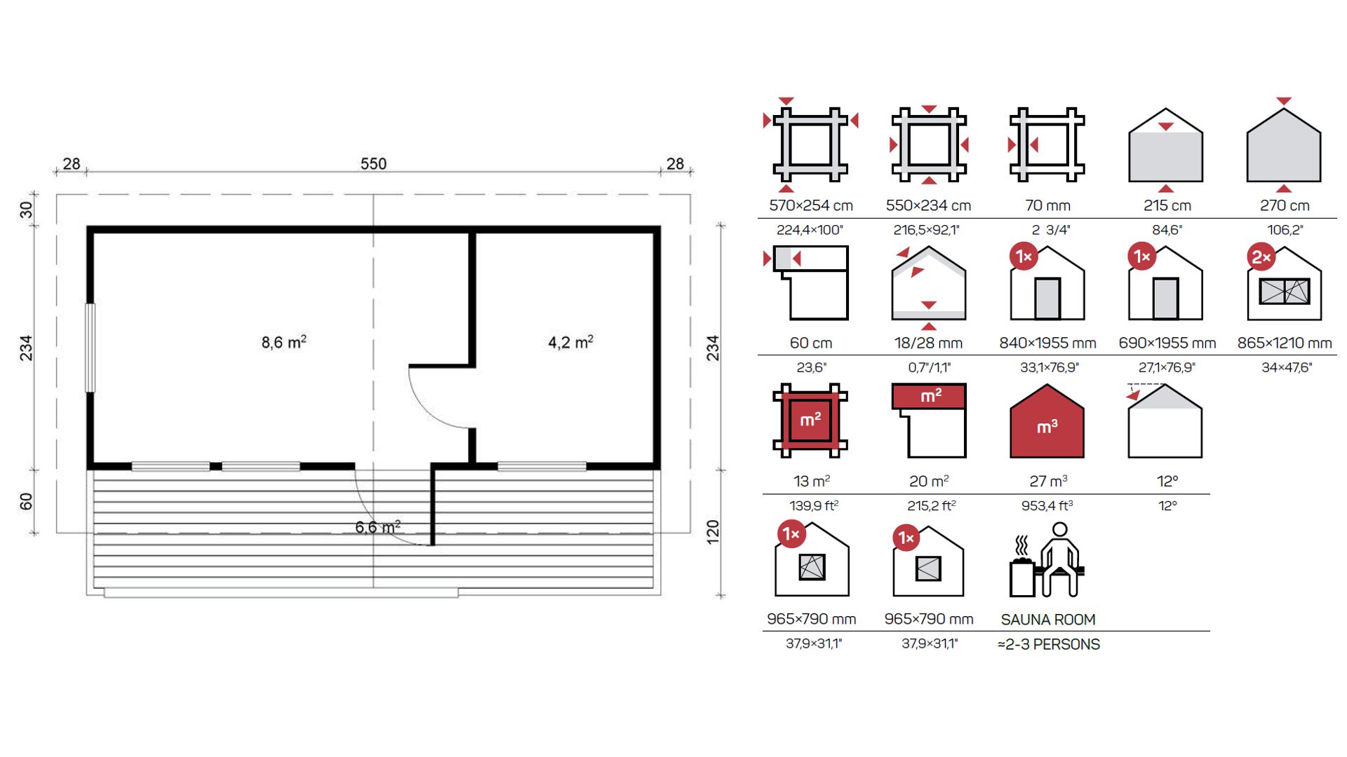 Set drvenih sauna debljine 70 mm uključuje sljedeće: